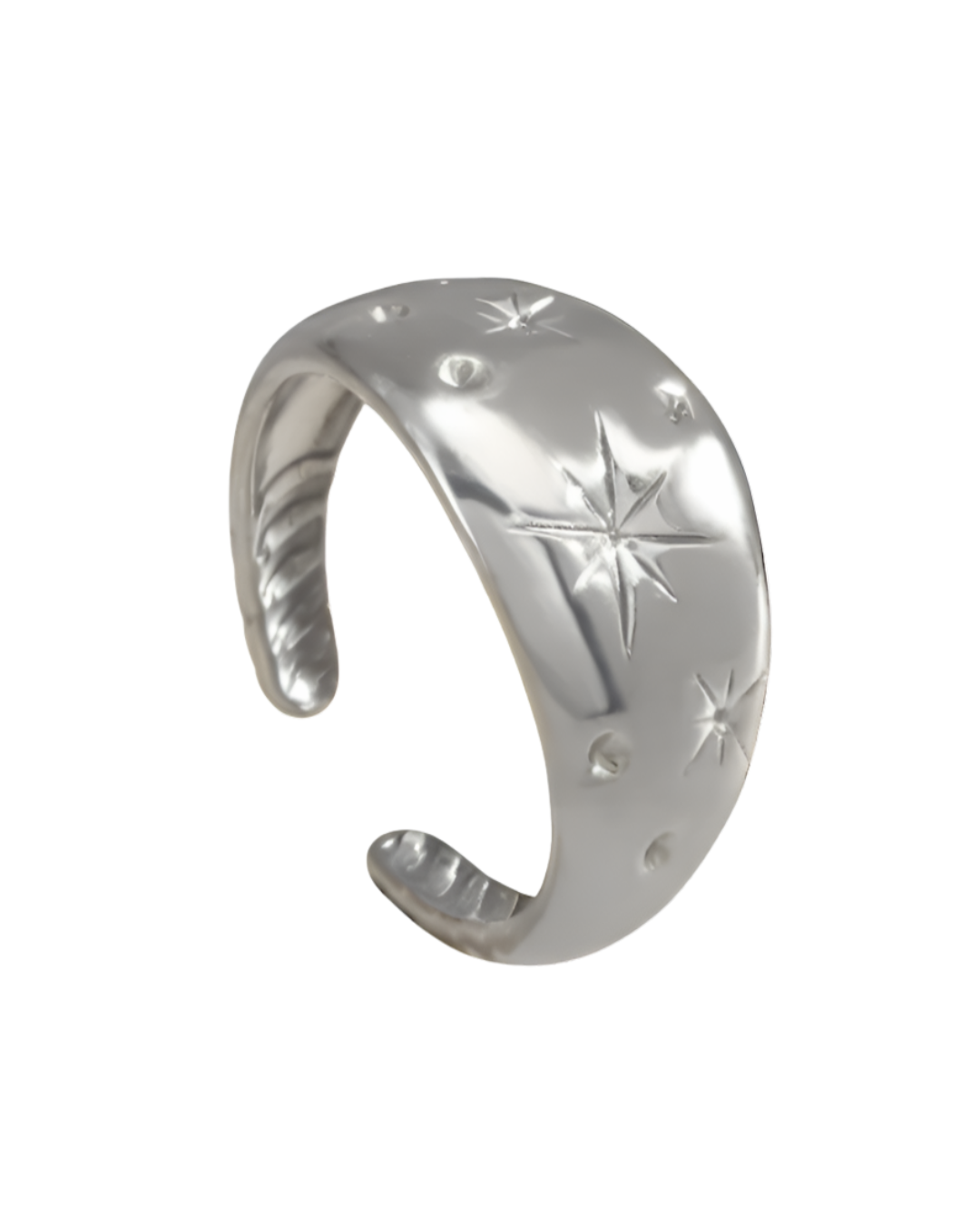 Adjustable stainless steel ring with a design inspired by celestial elements, available in gold and silver finishes. An elegant and mystical piece that adds a special and sophisticated touch to your everyday style. Water-resistant and comfortable for daily wear.